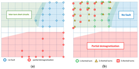 Experimental verification of the SOM-based fault detector of the PMSM motor: (a) partial demagnetization of the PMSM– SOM response for testing dataset; (b) assessment of stator damage degree—SOM response for testing dataset: Nsh—number of shorted turns.