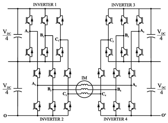 In this work, a medium-voltage open-end winding induction machine drive is presented. The topology of the proposed drive is shown in Figure 1, where each side of the machine winding is supplied by a three-level VSI based on two cascaded two-level three-phase inverters [32,33]. The main advantages of the cascaded two-level inverters compared to the conventional three-level NPC inverter are that the neutral point fluctuations are absent and fast-recovery neutral-clamping diodes are not needed. However, the bottom switches of inverters 2 and 4 need to be rated for the full DC-link voltage (VDC/2 for the case in Figure 1) [32], unlike the case of the three-level NPC inverter, where all the switches are rated for half the DC-link voltage (VDC/4 for the case in Figure 1) [34,35].