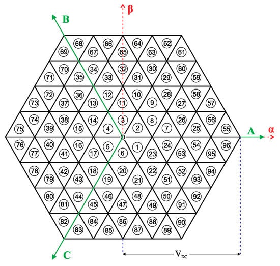 where , , and , , , are the corresponding pole voltages of inverters 2 and 4, respectively. By applying (1) to all the possible switching states, the 4096 voltage vector combinations can be grouped into 61 space locations and form a hexagon that can be divided into 96 sectors (Figure 2).