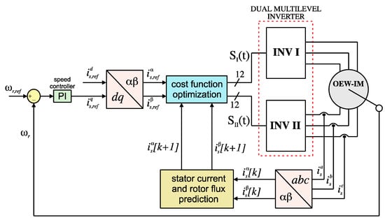 The objective is to select the switching state that minimizes this cost function. In general, this form of cost (or objective) function is the simplest possible form when using MPC. However, a larger predictive horizon and/or penalty on the change of the control input to regulate the average switching frequency could be included [37]. The proposed control scheme is shown in Figure 3, where an outer speed-control loop generates a q-axis current reference (associated with the torque) for the machine.