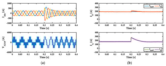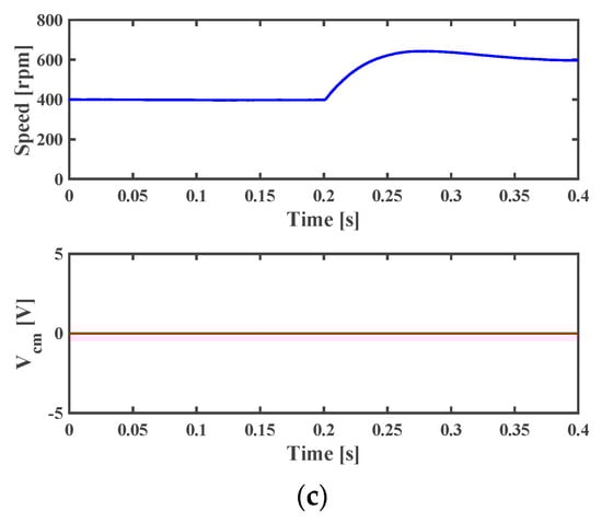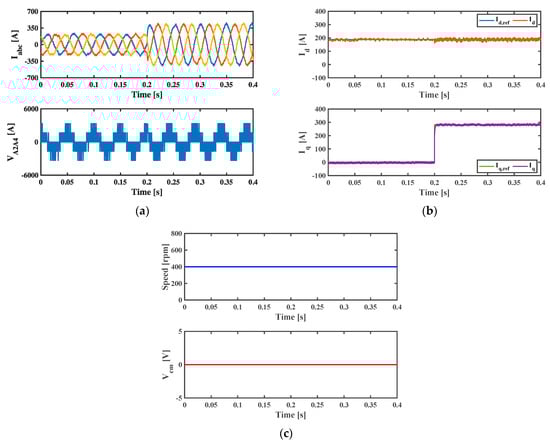 The first test was carried out to verify the performance of the current controllers considering a constant speed of 400 rpm. In this simulation, an initial speed was applied to the PSim induction machine model and the inertia coefficient was set to a high value to avoid speed variations during the current transients. A step change in the q-axis reference current from 0 to ~300 A was applied in t = 0.2 s. The d-axis reference current was kept constant at ~200 A. The results are presented in Figure 4. In Figure 4a, the machine currents and phase-A voltage are shown. The high-quality currents and five-level nature of the voltage can be seen. In Figure 4b, the correct tracking of the reference currents can be observed in the dq reference frame. Figure 4c shows the speed that remained constant during the test and the common-mode voltage at the machine terminals that was eliminated due to the specific set of vectors used in the predictive control algorithm.