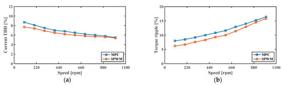 Comparison of MPC and SPWM. (a) Current THD as a function of the speed. (b) Torque ripple as a function of the speed.