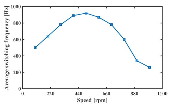 In an MPC strategy, the switching frequency is not constant but could vary depending on the optimization of the cost function (e.g., the same voltage vector selected and applied during two consecutive sampling periods will reduce the equivalent switching frequency). Figure 7 shows the average switching frequency obtained as a function of the speed.