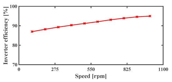 Finally, regarding the losses obtained using the proposed topology and control strategy, a brief efficiency analysis was carried out, again considering the variable speed with a rated constant torque. It is worth mentioning that the losses of the inverter were calculated using a well-accepted method [38] that considers simulated waveform data together with the power device manufacturer’s datasheet information (IGBT Semikron SKM300GA12T4, in this case) to calculate the conduction and switching losses. The obtained efficiency curve is plotted in Figure 8, which shows that a maximum efficiency of about 95% was obtained for the inverter.