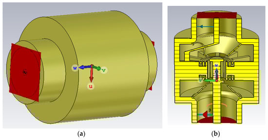 CST Particle Studio simulation model of the 12-vanes and 2.45 GHz CW magnetron. (a) Appearance and structure diagram of the magnetron. (b) Internal structure diagram of the magnetron.