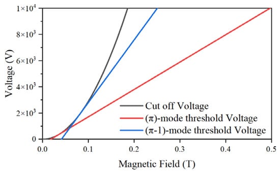 More precise function curves of working voltage and magnetic field are constructed following the resonant frequency of π-mode and π−1 mode and the particular size of the designed high-efficiency magnetron, as illustrated in Figure 3.