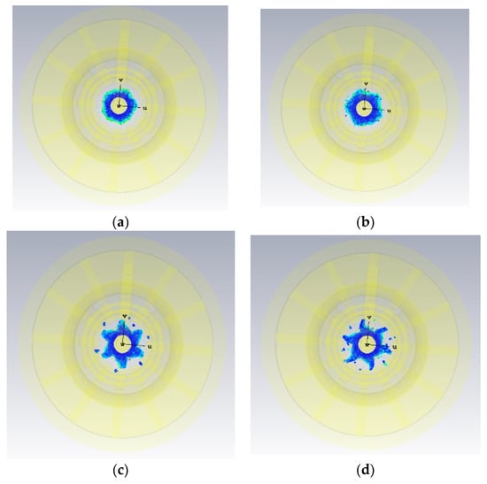 The production mechanism of the electron spokes is intuitively depicted in Figure 4. As the simulation advanced to 100 and 300 ns, we observed that electrons began to emerge from the cathode and create a cloud of electrons on the cathode’s surface. When the duration was closer to 425 ns, the electrons assumed a configuration resembling a hexagonal star, commensurate with the number of spokes predicted by the π-model. As the electron commenced to exchange energy with the high-frequency field, its shape transformed into a distinct hexagonal star at approximately 450 ns.