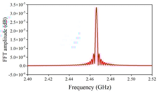 The frequency spectrum of the output port was determined using the Fourier technique, resulting in a steady frequency spectrum. As shown in Figure 5, the principal frequency oscillation frequency was 2.466 GHz, and the eigenmode was almost identical to that of the π-mode in the spectrum simulation; consequently, we can conclude that the magnetron operated in the π-mode. Small oscillations at various frequencies competed with the π-pattern. However, the π-pattern eventually dominated the competition, and the device began to operate without issue.