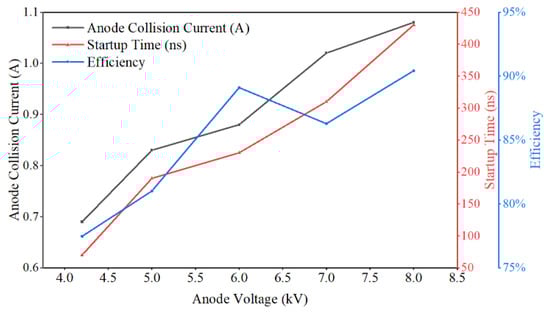 Different anode voltages and magnetic fields taken from the π-mode line were used to calculate the anode collision current, oscillation time, and electron efficiency.