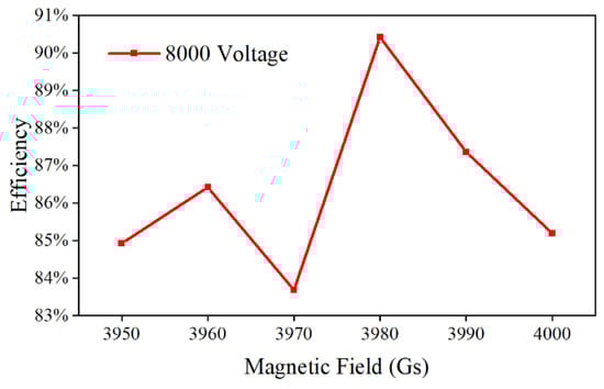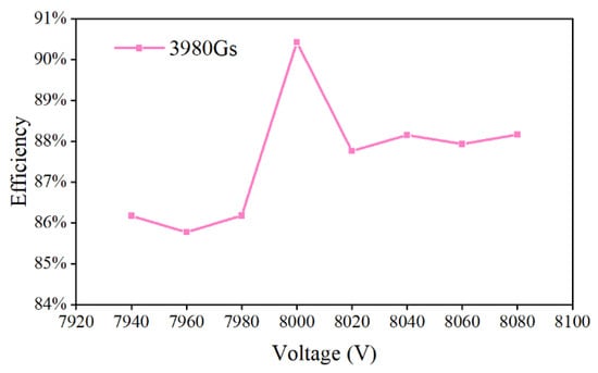 The magnetic flux density of a particular magnetron was 3980 Gs, which modified the magnitude of the anode voltage. As the anode voltage rose from 7940 V to 8080 V, there was a link between the operating efficiency of the magnetron π-mode and the anode voltage. As shown in Figure 9, the magnetron operated in π-mode, and the total work efficiency exhibited a fluctuating rising and gradually decreasing pattern. The highest value of work efficiency measured on the π-mode work line (8000 V) was 90.42%. At the remaining points within this range, productivity remained consistent at or above 85%.