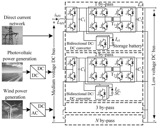 With the proposal of China’s “3060” dual carbon target, China’s current fossil-based energy sources have brought great challenges and opportunities, and it is foreseeable that access to a high proportion of new energy sources, such as solar and wind power, will become an important part of the AC/DC system [1]. Three-port DC converters, also known as energy routers or power electronic transformers [2,3], which enable access to renewable energy, energy storage unit access, power control and regulation, involve theories and technologies that have become a hot topic of current research. As the key equipment connecting distributed energy sources and energy storage units, the three-port DC converter can achieve electrical isolation on the high and low voltage side and provide interfaces to different voltage levels, power control and other functions. The individual converter is limited by disadvantages such as low voltage, power levels and small capacity, so most modular combinations are used to form modular three-port DC converter with inputs in series and outputs in parallel, as shown in Figure 1.