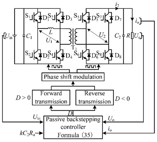According to the above analysis, the block diagram of the overall control system of the DAB converter based on passivity-based control is shown in Figure 4. Firstly, physical quantities such as the output voltage, current and input voltage of the DAB converter are collected and input to the passive backstepping controller; secondly, the phase shift compared to D of the converter is calculated according to expression (35), and according to the magnitude of the phase shift compared to D, the magnitude and direction of the transmitted power of the DAB converter is determined. Finally, after the phase shift modulation, a square wave is generated to drive the on and off of the switching tubes. When the appropriate injection damping Ra is selected, the output voltage Uo can quickly converge to the reference voltage Uoref.