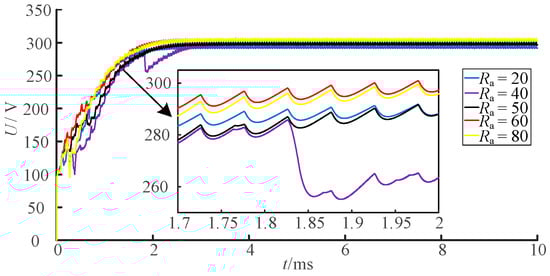 Passivity-based control establishes a controller based on the physical structure of the system. The goal is to make the whole closed-loop system passive. The method of injection damping is adopted, as described in Section 4.2, to improve the energy dissipation speed of the system and stabilize the system at the reference value. When the passive backstepping controller of the DAB converter selects different values of injection damping, the effect of the output voltage also changes. The output voltage response of different values of injection damping is observed to select the appropriate injection damping. Figure 6 shows the waveforms of the output voltage when the injection damping Ra is 20, 40, 50, 60 and 80 Ω, respectively. It can be seen from the simulation diagram that when the injection damping of the system is 20 Ω, the difference between the output voltage and the reference voltage is about 3.5 V, which does not reach the reference voltage value. As the injection damping increases to 40 Ω, the reference voltage reaches 300 V, but a jitter occurs. When it is increased to 60 and 80 Ω, the response time of the output voltage waveform decreases slightly, the increase is not significant, and it exceeds the reference voltage by 300 V.