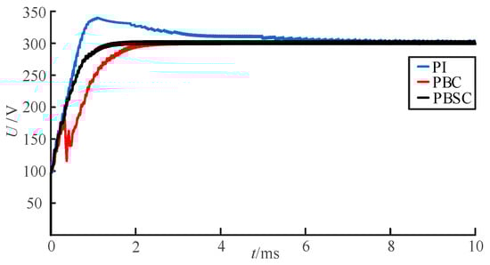 In order to verify the control performance of the designed passive backstepping controller, the traditional voltage closed-loop control [9] and passivity-based control are selected for comparison. The integral of the time-weighted absolute error (ITAE) index of the error signal is used to optimize the parameters of the PI controller [22] to ensure the optimal PI parameters, and the optimized values are Kp = 0.12 and Ki = 65. Figure 7 shows the comparison waveform of the DAB converter output voltage under the three control methods, and the simulation time is 10 ms. It can be seen that under the traditional PI control, the output voltage overshoots with the given value and reaches stability after 6 ms. The passivity-based control strategy can quickly stabilize the output voltage, reaching the given voltage of 300 V in 3 ms, but the jitter occurs from 1.05 to 1.57 ms. Based on passivity-based control, the passive backstepping control can achieve stability without jitter in 2.65 ms, which can quickly stabilize the output voltage, improve the response speed of the output voltage of the converter and has no overshoot, effectively solving the contradiction between the rapidity and overshoot of the output voltage.