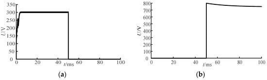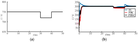 When the input terminal of the DAB converter is connected to distributed power sources such as photovoltaic and wind power generation, the input voltage is unbalanced due to the weather, resulting in the voltage fluctuation of the load terminal. Therefore, the converter must ensure the stability of the power supply. To simulate the operation of the DAB converter in response to the fluctuation of input voltage, the following assumptions are made: at 30 ms, the input voltage drops from 750 V to 720 V and rises again to 750 V at 40 ms. The whole simulation time is 50 ms, as shown in Figure 8a.
