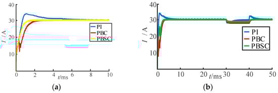 In the application field of traction power supply systems, facing the frequent braking condition of trains [24], a DAB converter is required to feed back the regenerative braking energy of trains to the port of the energy storage unit, and it can run stably. The waveform of output current under normal operation and input voltage disturbance is shown in Figure 9, and the comparison results of performance indicators are shown in Table 3. The above passive backstepping control strategy is adopted to realize forward and reverse transmission mode switching operation of the DAB converter, and reverse operation recovers braking energy.