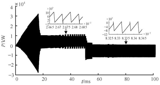 To verify the reverse power transmission of the converter, at t = 50 ms, the external trigger signal is changed so that the positive primary and secondary side “charge” is switched to the reverse primary and secondary side “charge”, and the change in “charge” terminal voltage before and after switching is detected. The specific switching is shown in Figure 5 to verify the forward and reverse transmission modes of the DAB converter. Figure 10a shows the forward transmission, in which the primary side transmits power to the secondary side, and the secondary side outputs the voltage waveform. Figure 10b shows the reverse transmission, in which the secondary side transmits power to the primary side, and the primary side outputs the voltage waveform. The simulation results show that the output voltage of the secondary side is 300 V in forward transmission. When the converter is 50 ms, the commutation occurs; that is, the forward and reverse transmission modes are switched, and the “load” terminal voltage of the secondary side changes to 0, at which time the secondary side is switched to “source”. The voltage on the primary side is switched from 0 at the source terminal to “charge”. After the switch, the primary “charge” reaches 750 V at t = 70 ms. At this time, it can quickly reach a stable operation state. Figure 11 shows the change in transmission power at the secondary side of the transformer before and after the switching of the converter. It can be seen that the converter realizes the reverse transmission of power. The simulation results show that the proposed passive backstepping control strategy of the DAB converter can realize the stable switching of power transmission modes. When the converter is connected to an energy storage unit, the regenerative braking energy can be fed back to the original side, thus realizing the flexible scheduling of peak shaving and valley filling of the whole system and power transmission.