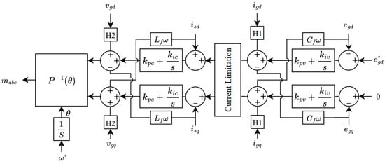 Where kpc and kic are proportional and integral gains of the current controller, respectively; kpv and kiv are the proportional and integral gains of the voltage controller, respectively; Cf, Lf and Rf are the filter capacitance, inductance, and resistance, respectively; and the gains H1 and H2 reduce the disturbances introduced into the control.