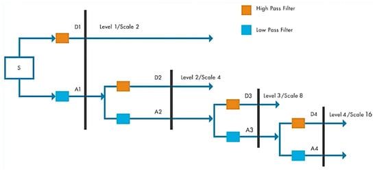 This procedure is repeated until the appropriate frequency band is attained and the proper information can be retrieved from the assessed signal. In Figure 4, the decomposition developed by the DWT can be seen. A and D represent the approximation and detail coefficients, respectively [35].