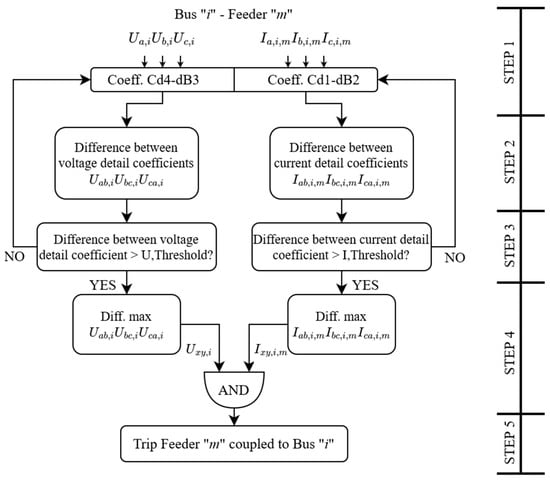 - Step 4: check whether the maximum differences between the voltage detail coefficients and current detail coefficients that have exceeded their established thresholds have the same phase sub-index x and y, i.e., Uab,i and Iab,i,m, Ubc,i and Ibc,i,m, or Uca,i and Ica,i,m.
