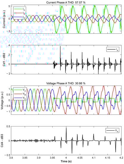 In contrast to the Fourier method, the wavelet transform offers both time and frequency localization [30]. This makes it possible to identify and evaluate the transients that can occur in electrical power systems [31]. Using wavelet coefficients, faults can be detected, since during transients they reach the maximum value of the modulus [32]. Thus, whether the coefficients exceed the established thresholds, a discrimination between faults and the nominal values of the electrical power system can be perfectly performed.