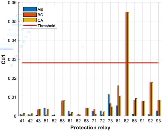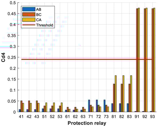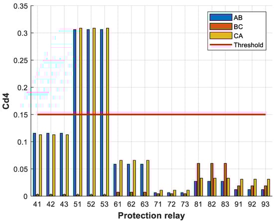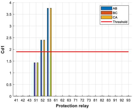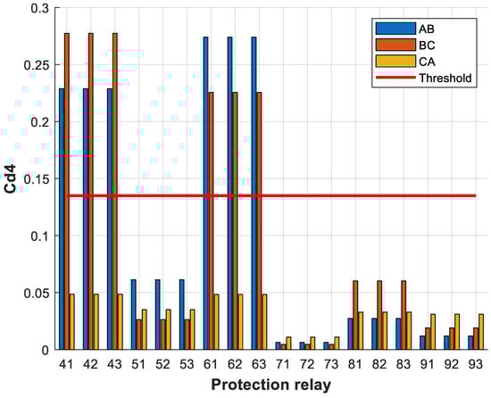 From the results obtained, the voltage threshold was set to 0.135 and the current threshold was set to 0.019. It can be seen from Figure 9 that relays 41, 42, 43, 61, 62 and 63 exceeded the voltage threshold, and from Figure 10 that relays 42, 61 and 62 exceeded the current threshold. In this case, however, only relays 42 and 61 were tripped, as they had the largest difference between the current detail coefficients on each bus. Thanks to the developed protection algorithm, the unnecessary tripping of protection relay 62 was avoided as it was not responsible for protecting the transmission line that connected buses 4 and 6.