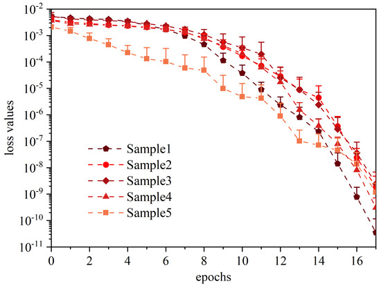 We first take and evaluate the convergence of our method with the number iterations (epochs), which is shown in Figure 2. We have used 5 independently generated training datasets to avoid any bias of training data, where each dataset contains 50 samples (compared to the whole number of independent samples ). We have also used the Broyden–Fletcher–Goldfarb–Shanno (BFGS) optimizer for all of the simulations in this work. We can see that our method converges very quickly for all the different groups of training datasets; concretely, the loss values for all the simulations drop to around within 20 iterations. However, the average fidelity (defined later in Equation (15)) of the reconstructed quantum states is only slightly higher than since the number of samples is too small; nevertheless, this issue can be overcome be enlarging the number of samples, as will be shown later.