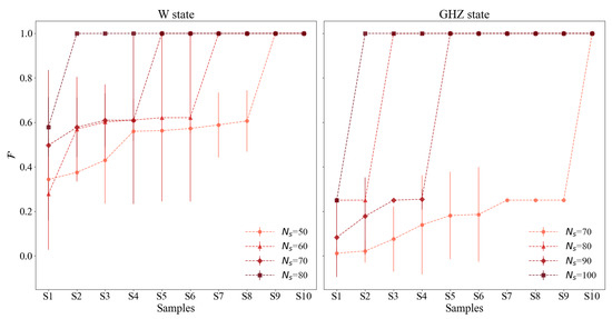 The results of this simulation are shown in Figure 3, where we have considered both the W state and the GHZ state. We can see that when the number of samples is not large enough, there is a significant chance that this will result in a wrong state compared to the target quantum state; however, as increases, different runs could converge to the target state (the minimal required to reach a certain fidelity for a given quantum state is studied later). Concretely, we can see that for the W state with considered, is enough to ensure most of the simulations using a different training dataset and with different initialization to converge to the correct state (except for one training dataset, whose average quantum fidelity is only around for ), while for the GHZ state, is required to reach the same precision. In all these simulations, the loss values have converged to lower than .