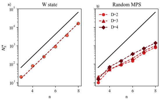 Finally, we study the scaling of the minimal number of samples in the training dataset, denoted as , such that of the randomly generated training dataset can result in an average quantum fidelity above (we still use 10 training datasets and 100 random initialization for each simulation), against the number of qubits n, which is shown in Figure 4. From Figure 4a, we can see that for W states still scales exponentially with n; in fact, is approximately of the total number of samples (the black solid line). In Figure 4b, we also study randomly generated MPSs, which may be generated using random quantum circuits in the experiment. We can see that in this case scales sub-exponentially for the different bond dimensions considered. Interestingly, although W states seem to be much simpler compared to a randomly generated MPS, in our approach we can construct the latter class of states much better than the former.