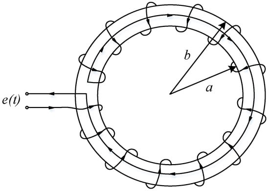 Conventional Rogowski coils are constructed by uniformly winding turns of a coil on a non-magnetic skeleton of constant cross-sectional area, in which the winding returns to the starting point along the central axis of the winding. Figure 1 shows a sketch of the structure of a Rogowski coil uniformly wound on a circular skeleton. Its working principle is based on the law of electromagnetic induction and Ampere’s law of loops. When the alternating primary current passes vertically through the center of the coil, a magnetic field is generated around the current, and the alternating magnetic induction lines induce an electric potential at both ends of the line turns, which is proportional to the rate of change of the primary current against time. The PCB Rogowski coil is wound on the copper-coated plate, but it works the same way as the traditional Rogowski coil. Figure 2 is the structure of the PCB Rogowski coil [40].