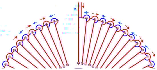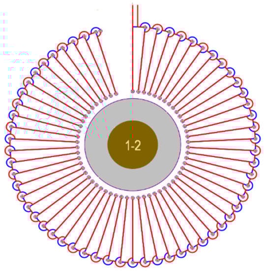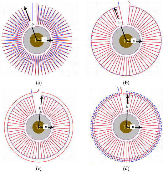 Coil 1 connects the top (red) alignment to the bottom (blue) alignment through holes on the inside and outside [42], with a rectangular wire turn cross-section. This coil has a relatively simple wiring structure, but the individual wire turns formed by the top and bottom alignments are not centrally symmetrical, and no return loop is provided. Coil 2 improves the above defects. The bottom layer straight trace of this structure (covered by the top layer straight traces) is connected to the top layer straight trace through the through-hole and forms an arc with radius and arc of 2π/2N clockwise. The bottom (blue) arc is connected to the top (red) arc by an outer via, so the symmetry of the line turns formed in this way is strong. However, because no return loop is set, the connected N-turn coil is equivalent to a large wire turn of radius b on the outside. When the magnetic field perpendicular to the PCB plane generated by the external interference current crosses the PCB coil plane, an interference-induced voltage is generated.