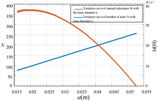 Therefore, when the value of the outer diameter is fixed, both the number of turns and the mutual inductance coefficient of the coil will be affected by the inner diameter a. According to the coupling relationship between Equations (10) and (11), the change curve is shown in Figure 9. The number of coil turns increases linearly with the increase of inner diameter a, while the mutual inductance coefficient becomes larger first and then decreases with the increase of inner diameter. Theoretically, when a is 18.6 mm, is 90 and the mutual inductance coefficient can reach the maximum. At this time, the radius of the outer arc of the coil is 0.8 mm, which can also meet Equation (11).