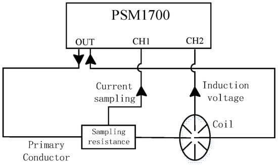 In order to test the characteristics of the coils with different winding methods, the experiments were conducted by using the PSM1700 frequency response analyzer and calculating the mutual inductance coefficients of the coils. This experiment does not apply additional shielding measures to the coil, nor does it integrate and signal process the output of the coil, and the experimental frame diagram is shown in Figure 11. Among them, the PSM1700 frequency response analyzer comes with a signal generator function, and the sine wave signal output from its output is used as the primary current input of the coil. The output wire of the PSM1700 is passed vertically through the center of the PCB coil, and the CH1 channel of the PSM1700 is used to collect the primary current signal through the sampling resistor, CH2 collects the output signal of the coil, and a Bode plot of the coil transfer function is displayed on the instrument panel. In this case, the sampling resistor is a 1 Ω high-precision sampling resistor.