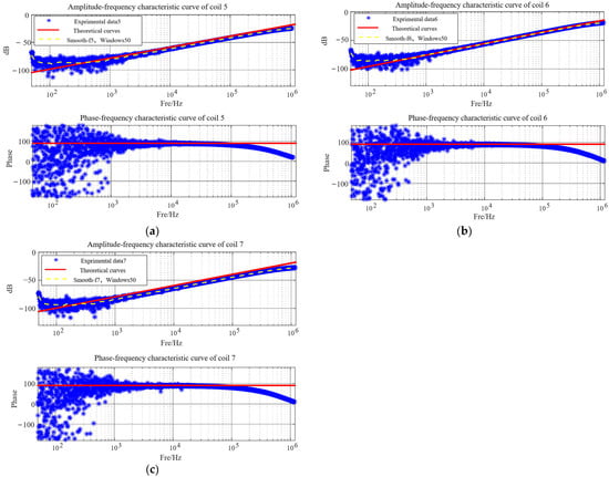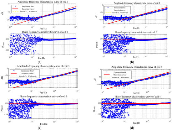 Figure 12 shows the amplitude-frequency characteristics of the frequency response of the four coils. The blue dots are the experimentally measured waveforms. The red solid line is the theoretical curve. The yellow dashed line is the curve after smoothing the experimental data.
