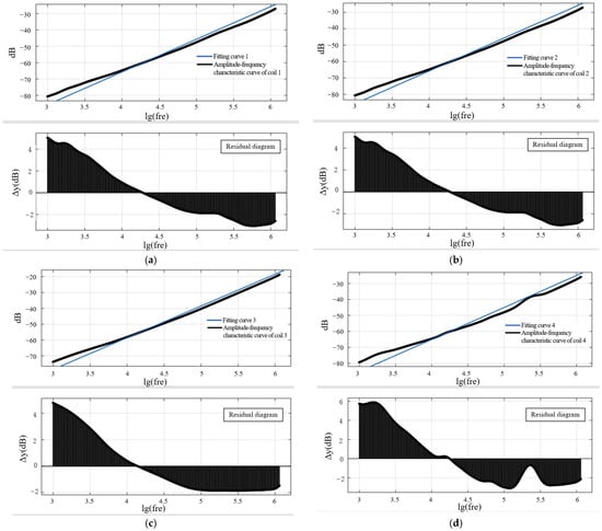 Figure 13 shows the fitted and residual results of the amplitude-frequency characteristic curves of coils 1–4 after the logarithmic transformation of the horizontal coordinates. It seems that the error between the fitting result of coil 4 and the measured result is the largest, the error of coil 3 is smaller than that of coil 1 and coil 2. Table 3 shows the measured mutual inductance values obtained from the fitted curves, where the mutual inductance values of coils 1 and 2 have a large error, coil 3 has an error of −29.4%, and coil 4 has the smallest relative error of −26.9%.
