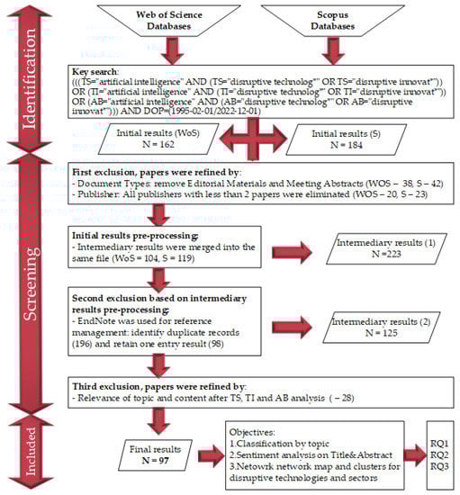 From the pool of 162 (WoS) and 184 (S) papers initially identified using the key searches, we applied several exclusions (check Figure 1) based on the methodology used by researches focusing on similar topics [,], namely: