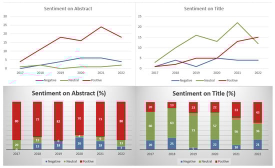 The results of the sentiment analysis (displayed in Figure 2) reveal that the abstract analysis returned mostly positive values, with percentages between 70% (2020) and 89% (in 2022). The title analysis revealed results that correspond more closely to a neutral assessment, although, for most years, the positive percentage is equal to or higher than the negative percentages. The exception to the above rule is the year 2018 (positive 13% vs. negative 25%). This is because the titles from 2018 refer to “disruptive” with a negative connotation, inducing a certain fear of technologies rather than a comforting sentiment. Nonetheless, the study of abstracts, which is more thorough than titles, yields a higher positive percentage (73%) than the negative share (13%). A possible explanation for this could be that the authors might have partially expressed their real sentiments in the titles. Given this circumstance, we highly advise performing sentiment analysis on more complete information (i.e., using abstracts and introductions rather than just titles or keywords), or analyzing variables in pairs (e.g., abstract–title and introduction–title), for a more comprehensive analysis.