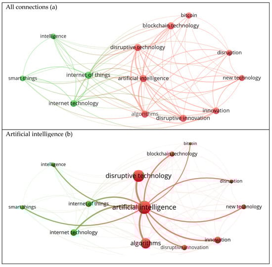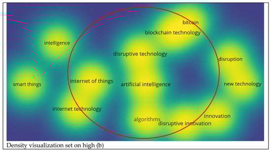 The item density visualization was created using the Association Strengths Normalization Method, with the kernel width set to the minimum value in Figure 4a, as opposed to Figure 4b, where the kernel width was set to the highest value. The fact that the connections between the items (keywords in this visualization) tend to overlap and show significant relationships between them may confirm that the topics are related and thus correctly selected. The overlapping area between the keywords is highlighted with a red circle in Figure 3b. Furthermore, as this review’s title suggests, the illustrations in Figure 3 and Figure 4 clearly show that “Artificial intelligence” and “disruptive technology” are the main aspects (keywords) of the analysis and may justify the correct inclusion of the articles in the analysis.