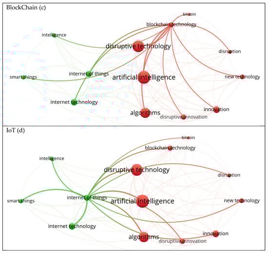 Furthermore, Figure 3a displays the connections between the main (top 3) identified disruptive technologies. Among others, all four (a, b, c, and d) graphical representations show that the term Disruptive technology is more frequently associated with the top three technologies (AI, IoT, and BlockChain) compared with the term Disruptive innovation.