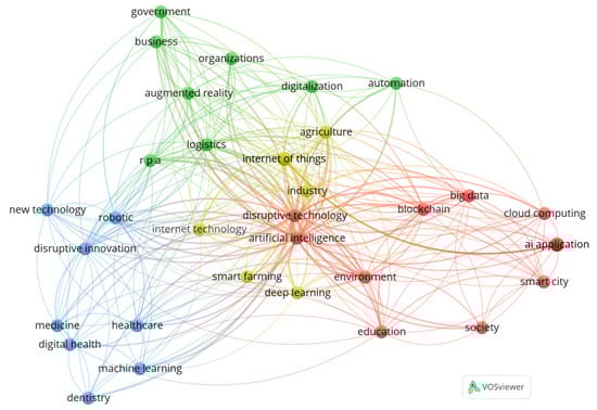 In our endeavor to answer RQ3, we employed the VOSViewer program. This software has been recognized as enabling state-of-the-art approaches [] to network clustering, wherein the extraction of the key domains and associated key technologies from the database of articles is more effective (n = 97). The four clusters identified by the above-mentioned tools are displayed in Table 2, and the entire network map is revealed in Figure 5.