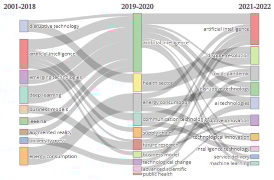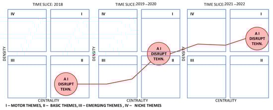 Figure 9 reveals the conceptual structure of the most relevant topics (AI and Disruptive technology) over the temporal sub-periods. In this way, it is possible to shape the topical evolution of the domain starting from the thematic evolution (Figure 7), thereby revealing the trajectories of the different topics across time (namely, 2018, 2019–2020, and 2021–2022). Figure 9 shows that while AI and disruptive technology were regarded as fundamental subjects in the 2018-published papers, the manuscripts produced between 2019 and 2020 partially progressed towards regarding them as major themes, and in the papers released between 2021 and 2022, these two topics were considered a fertile area for study.