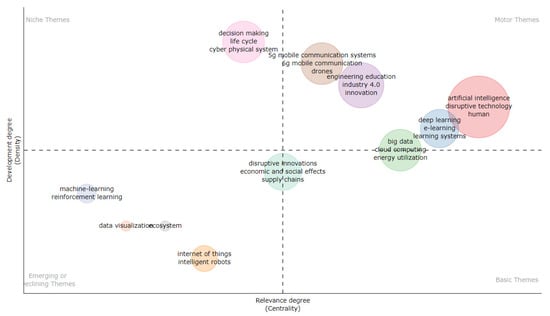 The graphical representation from Figure 8 reveals that during the production of manuscripts between 2021–2022, the major themes (aspects considered hot topics) were AI, Industry 4.0, DL, Big Data, 5G, 6G; the niche themes were related to the decision-making process, (product) life cycles, and cyber physical systems; and the emerging themes were the IoT, intelligent robots, ML, and reinforcement learning. The Figure also shows that the topic disruptive innovation is placed in a prominent position in terms of its relevance degree (centrality), thus confirming that the manuscripts deal with the disruptive effect of innovative technologies.