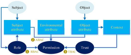 The framework of the access control model according to the previous research work is shown in Figure 1 [,]. The access authorization process is divided into three main steps: ① role-based access control (RBAC); ② attribute-based access control (ABAC); and ③ trust-based access control (TBAC).