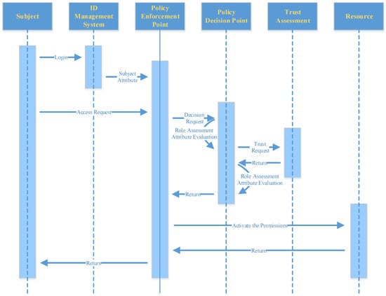 As a context-dependent dynamic variable, trust dynamically determines whether to authorize and the scope of authorization []. Because of the decisive role of trust in authorization in the zero-trust requirement, the first thing to be solved is trust evaluation. In the process of access control, when the policy decision point receives the decision request submitted by the policy enforcement point, it needs to obtain the trust value of the subject as well as the required attributes for authorization. Moreover, the policy decision point decides whether to allow the subject’s access request and the specific access rights according to the authorization policy. In such an authorization mechanism, trust evaluation and authorization are closely related and run through the whole process of the subject (access applicant) accessing the object (data resources). The relationship between trust evaluation and authorization can be described in the following three stages: