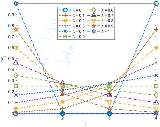 The value of λ needs to be set according to the requirements. In order to meet the requirement that the longer the current interaction time is, the smaller the impact of the historical behavior on the current trust evaluation is, look for the law of changing with the λ value. Assuming that n is 4, take, respectively, and calculate the weight sequence (as shown in Table 2). When λ = 0.5, . Moreover, the values of are distributed in a centrosymmetric manner.