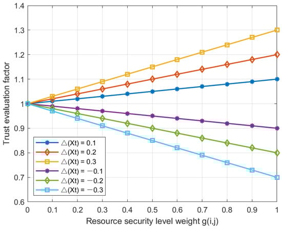When ∆(Xt) changes, the effect of resource security level weight g (i, j) on the trust update is verified, as shown in Figure 5.
