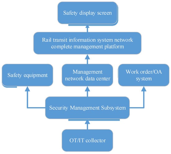 Intelligent transportation systems will further force traffic depth perception to increase, traffic information to be ubiquitous, traffic data to be pervasive, and traffic safety and efficiency to increase []. The overall planning of rail transit networks is generally divided into three regions: the production network, management network, and internet []. The division of the production network is divided into the production core network and production auxiliary network. The division of the management network is divided into production management network, OT security data collector logs, traffic data, security alarm data, collected user asset traffic logs, and other information. The management network realizes service management, organization management, asset management, vulnerability management, and alarm management service functions, and builds a basic information database, raw database, and knowledge database to provide data support for access authorization control. The information flow is shown in Figure 6.