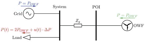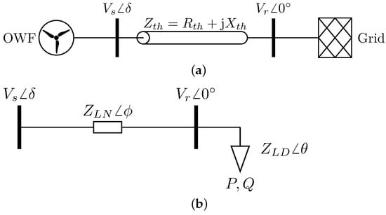 This network is comparable to an OWF generating power for the grid, which is seen as a load, as illustrated in Figure 2b. The total complex power is considered: