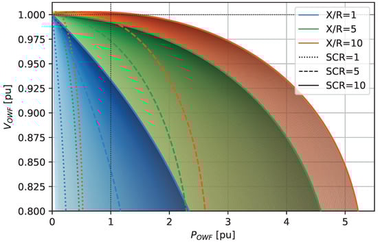 It is acknowledged that the SCR has a larger impact on the voltage stability margin seen at an operation point at pu, and it is emphasized that a combination of weak grid conditions raises compliance concerns without any other grid-stabilizing equipment being considered. Acquiring flexible AC transmission system (FACTS) devices is costly [] and would eventually challenge the techno-economic feasibility of an OWF project.