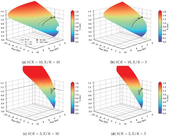 To better illustrate the impacts of the SCR and the ratio on the steady state from the feasible solution space provided by (7) and the increased voltage stability margin obtained by injecting reactive power, the solution of the voltage from the equation was mapped into a PQ space. This resulted in the PQV surface plots in Figure 5, where , and the PV curves are for .